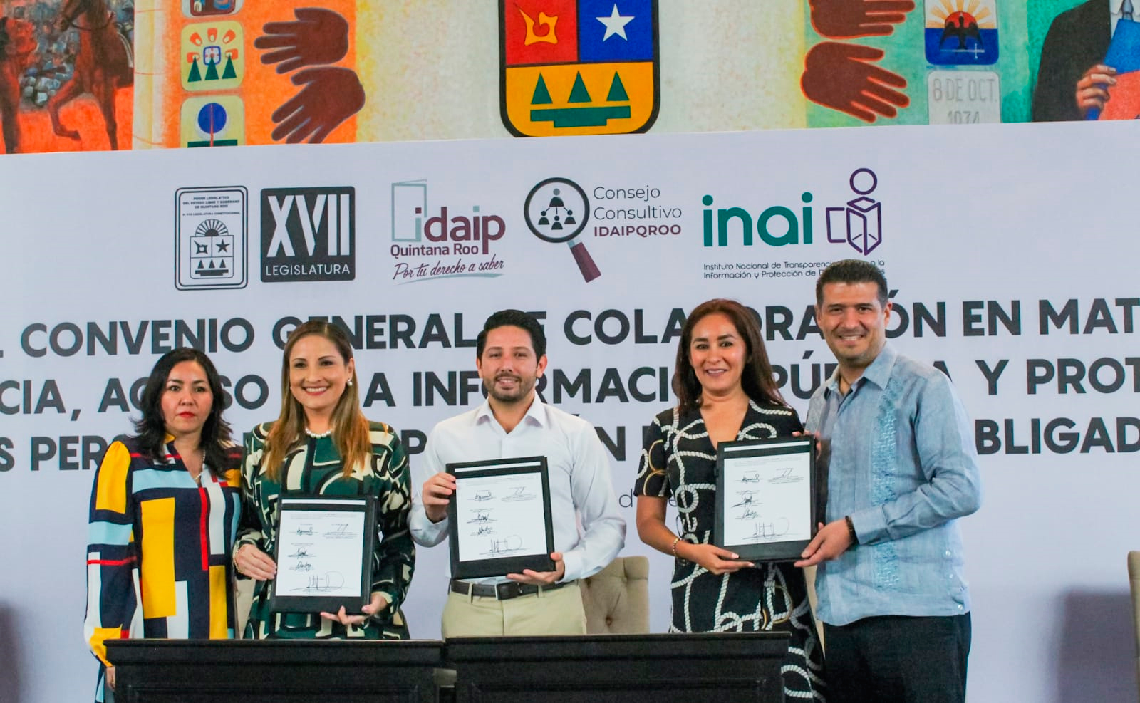 Comisionado del INAI, Adrián Alcalá Méndez, Claudette Yanell González Arellano, Comisionada del IDAIPQROO y Carolina Mendoza Polanco, Presidenta del Consejo Consultivo del IDAIPQRO, firmaron igualmente el convenio como testigos ante Diputados, titulares de Unidades de Transparencia y servidores públicos de diversos organismos.